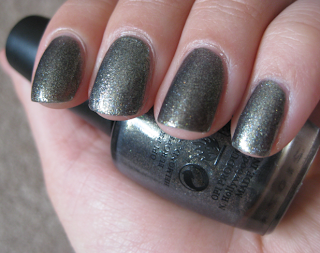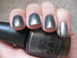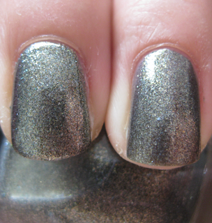 Both polishes are a deep greenish-charcoal grey micro-shimmer almost glitter looking. There's charcoal, gold, green, a silvery color, and an ever slight hint of blue.