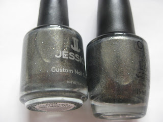 So, I present to you Jessica Smoky Feather. I'm not sure where you can purchase these polishes but I buy mine from a local nail supply. But you can purchase Jessica polishes here. Both polishes were 2 coats although Smoky Feather is a lot more opaque than Number One Nemesis. Both polishes applied like butter, very smooth. The only difference that I see, is that Number One Nemesis has a slightly darker base but from a far, you could hardly tell. Smoky Feather is also glossier with no topcoat applied. Other than that, you can be the judge. As for me, I would say that Smoky Feather is close enough to be a dupe.
